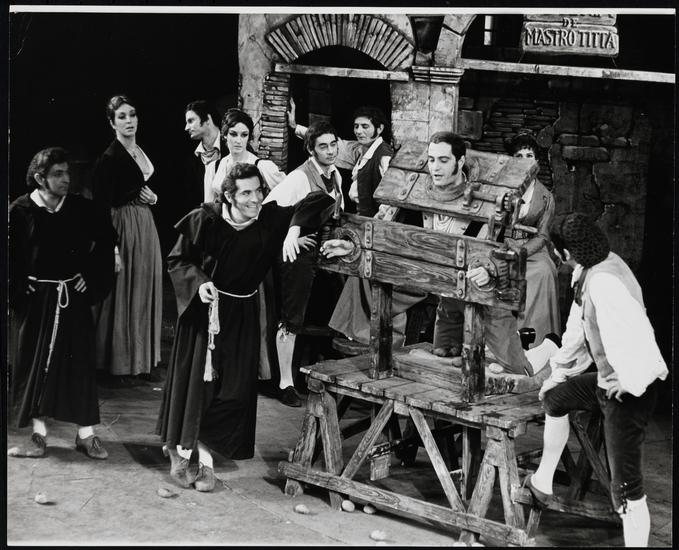 [Nino Manfredi in the title role, Ornella Vanoni as Rosetta and Aldo Fabrizi as Mastro Titta in "Rugantino".]
