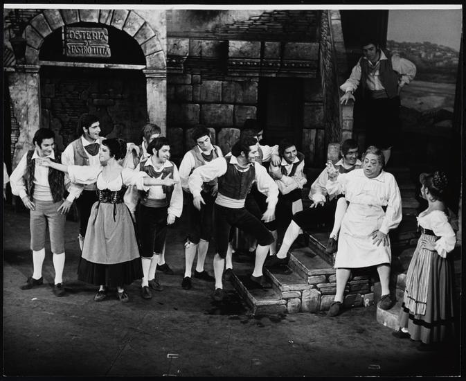 [Nino Manfredi in the title role and Ornella Vanoni as Rosetta in "Rugantino".]