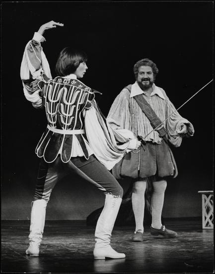 [Joel Higgins as Sebastian, Sherry Mathis as Olivia and Catherine Cox as Viola in "Music Is".]