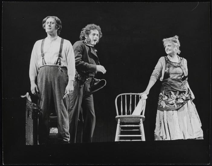 [Jack Eric Williams as The Beadle, Len Cariou in the title role and Angela Lansbury as Mrs. Lovett in "Sweeney Todd".]