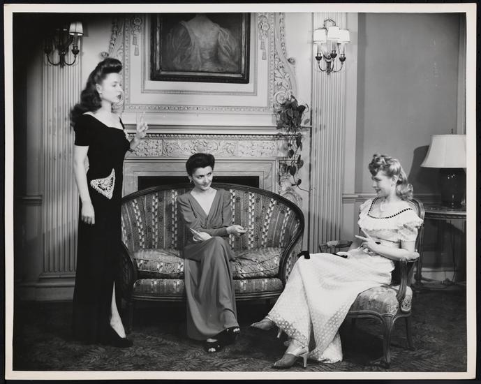 [Ralph Clanton as Lieutenant James Richardson, Sally Gracie as Miss Kathlene Stirling and Philip Denman as Donald Bacchus in "Victory Belles".]