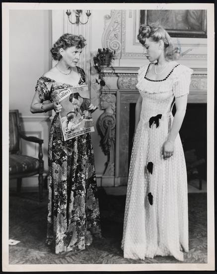 [Ellen Merrill as Miss Ann Stewart and Stanley Phillips as Private Eric Stanley in "Victory Belles".]