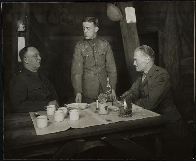 [Derek Williams as 2nd Lieut. Raleigh, Victor Stanley as Private Mason and Leon Quartermaine as Lieut. Osborne in "Journey's End".]