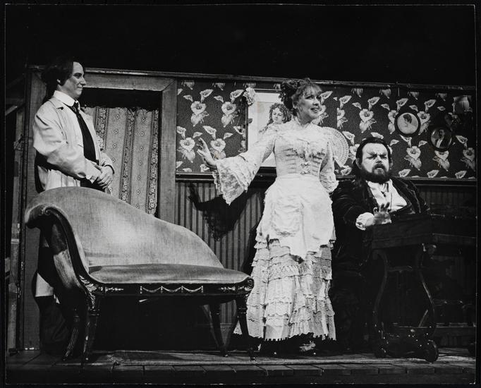 [Jack Eric Williams as The Beadle, Len Cariou in the title role and Angela Lansbury as Mrs. Lovett in "Sweeney Todd".]