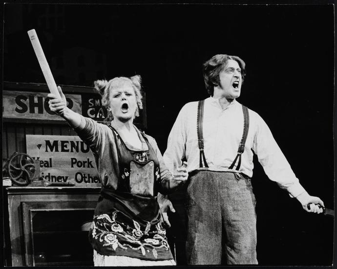 [Angela Lansbury as Mrs. Lovett and Len Cariou in the title role of "Sweeney Todd".]