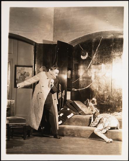 [Arthur Wontner as Sir John Marlay, M.D. and Kathlene MacDonell as Deborah Kane in Act 2 of "Interference".]