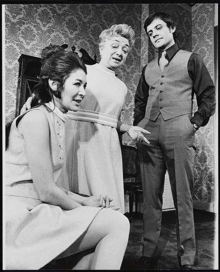 [Molly Picon as Hortense Brand, Sam Levene as Daniel Brand and Terry Kiser as Roger Brand in "Paris Is Out!".]