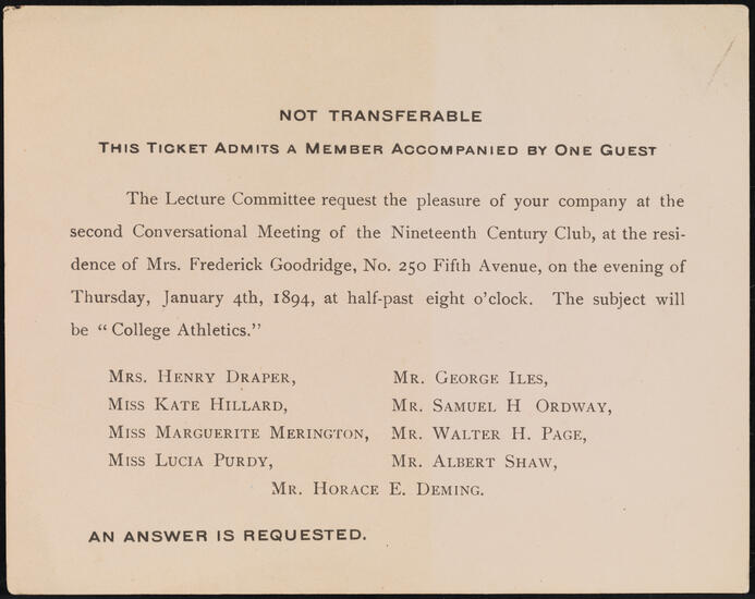 The Nineteenth Century Club requests the pleasure of your company to hear a discussion by the Hon. Wm. L. Wilson and Prof. James Schouler