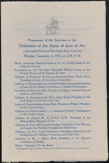 Riverside Drive and 93rd Street. Joan of Arc Statue [at] Riverside Drive and 93rd Street. [Mayor's Committee to Welcome British & French War Commissions.]