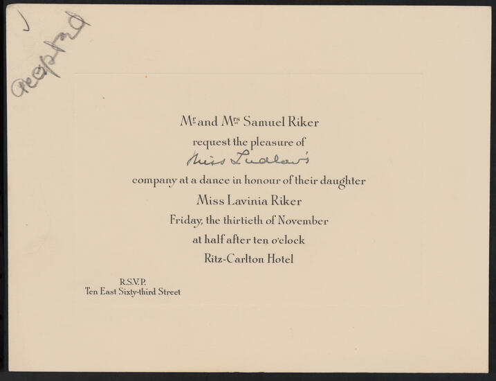 [Mr. and Mrs. Percy Avery Rockefeller request the pleasure of Miss Ludlow's company at a dance in honour of their daughter Miss Faith Rockefeller.]