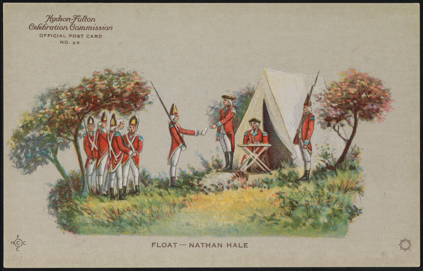 In Sept., 1776, Capt. Nathan Hale volunteered to enter the enemy's lines to gather information on the British army, disguised. He was discovered and hanged Sept. 21, 1776, regretting that he had but