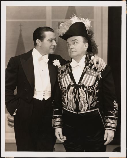 [William Gaxton as Jim Taylor and Victor Moore as Senator Oliver P. Loganberry in "Louisiana Purchase".]