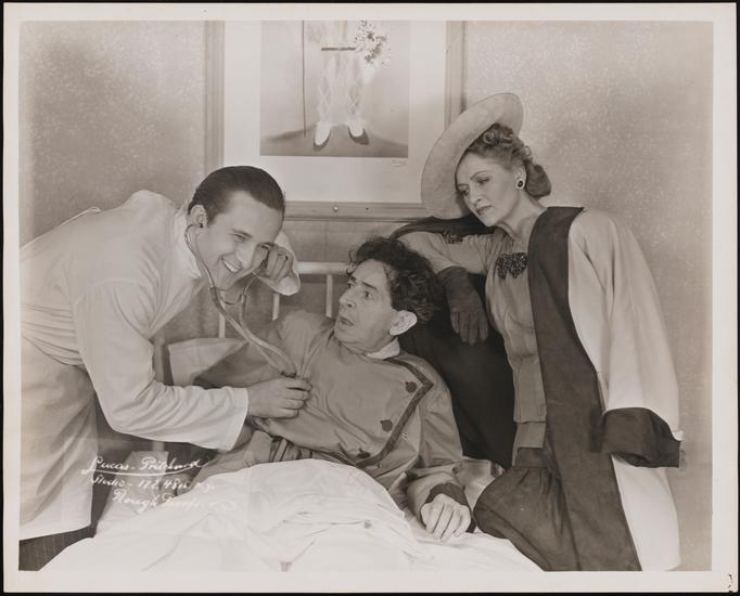 [David Burns as Walters, Willie Howard as Barney Short and Ethel Shutta as Daphne Drew in "My Dear Public".]