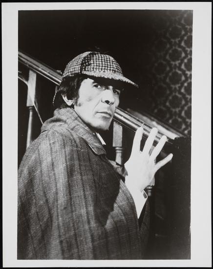 [William Gillette in the title role and Peg Entwistle as Alice Faulkner in "Sherlock Holmes".]