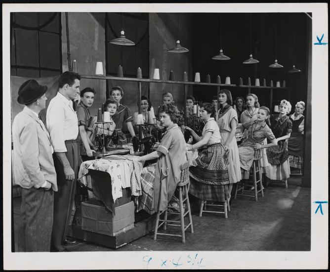 [John Raitt as Sid Sorokin, Eddie Foy, Jr. as Hines and Pat Marshall as Babe Williams in "The Pajama Game".]