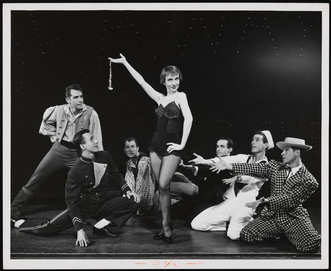 [Jim Hutchison as Eddie, Helen Gallagher as Gladys and Frank Derbas as a Worker in the "Steam Heat" number in "The Pajama Game".]