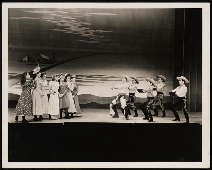 [The dance in Old Man Skidmore's barn in "Oklahoma!".]