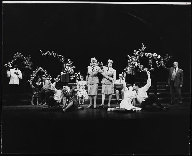 [Janie Sell as Mitzi, Patty Andrews as Paulette de Paul and Maxene Andrews as Pauline de Paul during "Eight to the Bar" number in "Over Here!".]