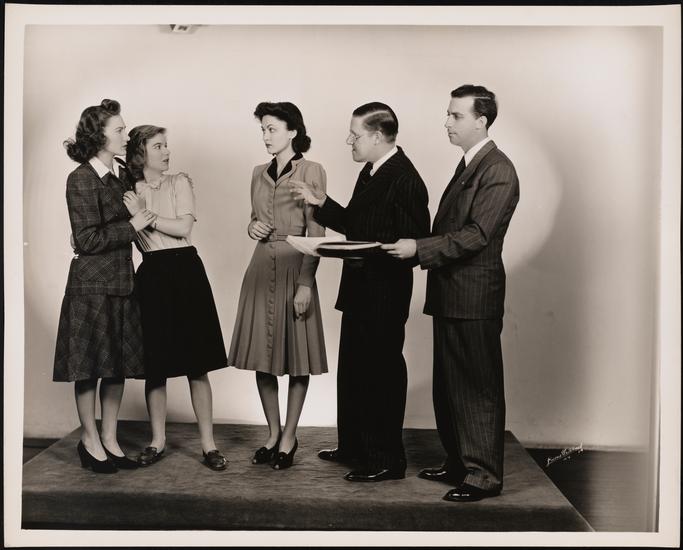 [Cast of "Nine Girls" with director Reginald Denham and playwright Wilfred H. Pettitt.]