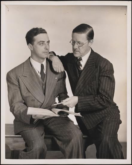 [Cast of "Nine Girls" with director Reginald Denham and playwright Wilfred H. Pettitt.]