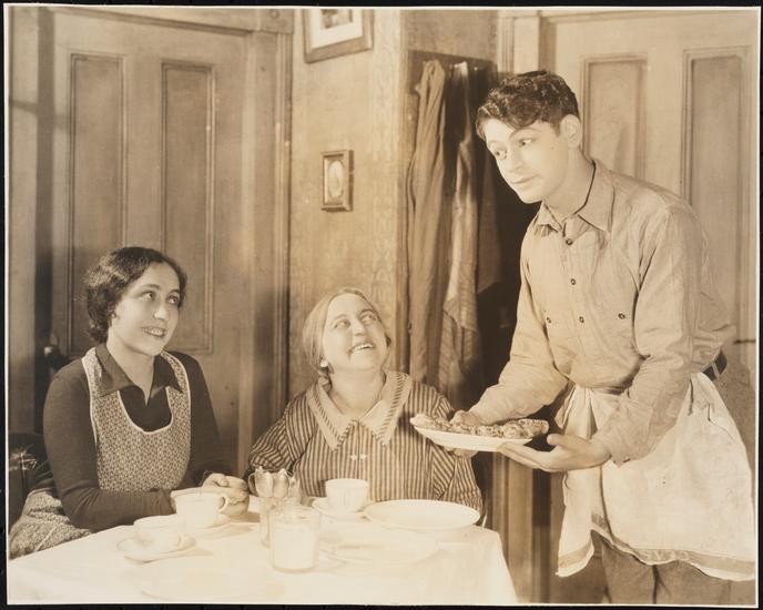 [Clara Langsner as Sarah Becker, Paul Muni as George Simon, and Joseph Pevney as Harry Becker in "Counsellor-at-Law".]