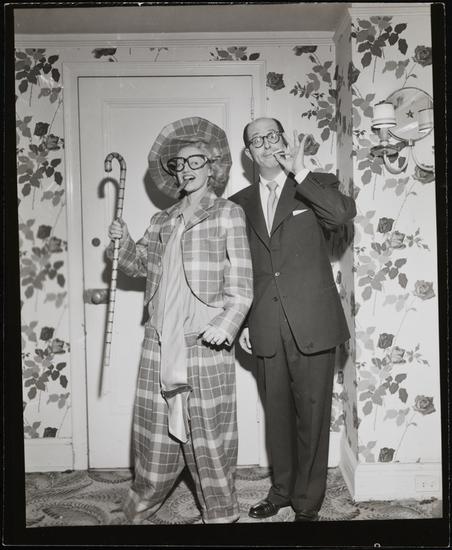 [Phil Silvers, Paula Stone and Bert Lahr at a party for "Top Banana".]
