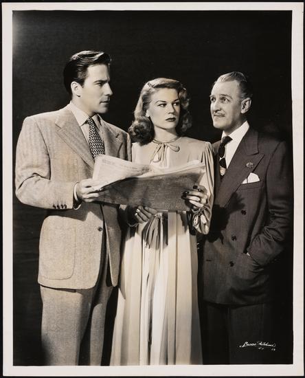 [Tom Rutherfurd as Shelby Carpenter, K. T. Stevens as A Girl and John Loder as Waldo Lydecker in "Laura".]