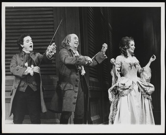 [Betty Buckley as Martha Jefferson, William Daniels as John Adams and Howard Da Silva as Benjamin Franklin in "1776".]