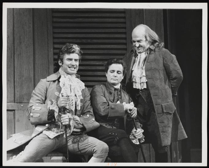 [Jon Cypher as Thomas Jefferson, Howard Da Silva as Benjamin Franklin and William Daniels as John Adams in "1776".]