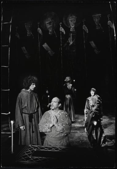 [Irene Ryan as Berthe and John Rubinstein in the title role of "Pippin".]