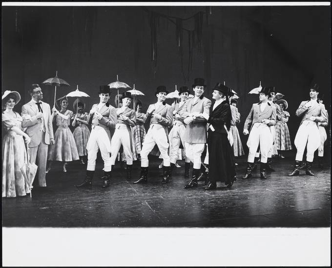 [Angel Lansbury backstage with two unidentified men during the production of "Mame".]