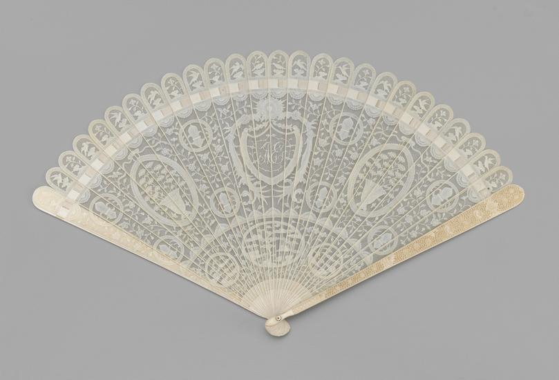 Brisé ivory fan, Neo-Gothic style carved and painted blades with original box