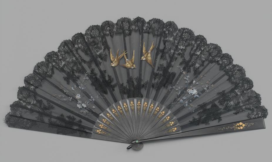 Folding fan of painted, gilded, and embroidered black silk leaf