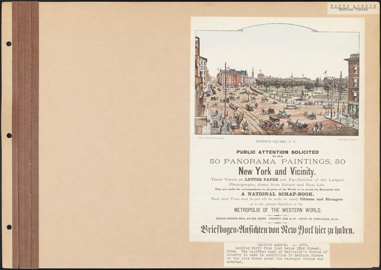 Description Madison Square N.Y. ca. 1876. Looking North from just below 23rd Street. Note: The uplifted hand of Bartholdi's Statue of Liberty is seen in exhibition in Madison Square on the site where later the Farragut Statue was erected | From Panorama Paintings of New York and Vicinity | J. Clarence Davies Street Views Scrapbook