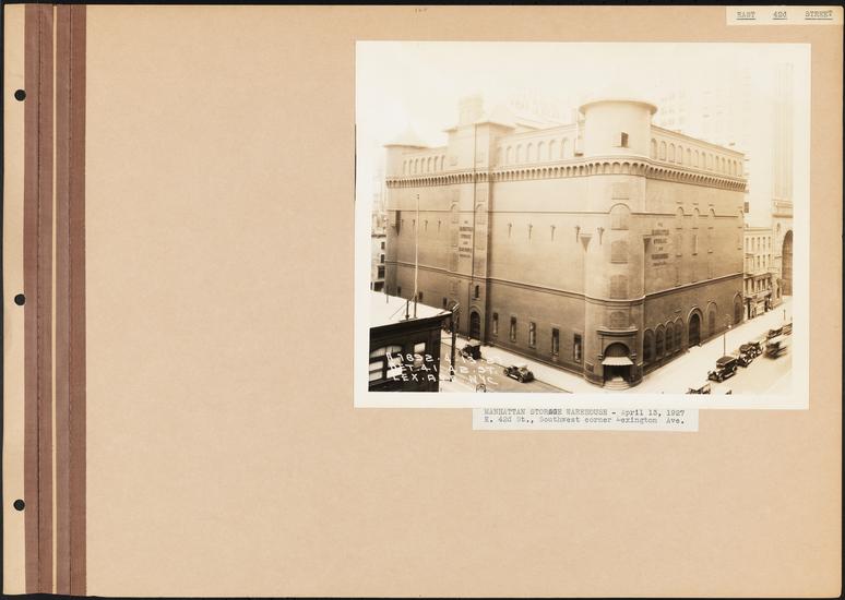Manhattan Storage Warehouse - April 13, 1927. East 42d St., Southwest corner Lexington Ave. | J. Clarence Davies Street Views Scrapbook