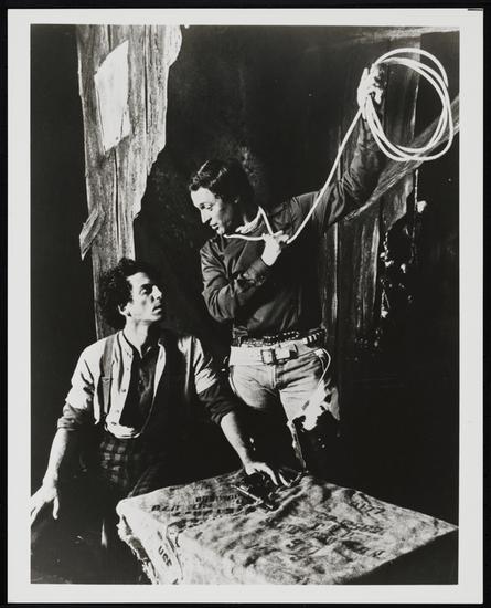 [Martin Vidnovic as Jud Fry and Lawrence Guittard as Curly in "Oklahoma!".]