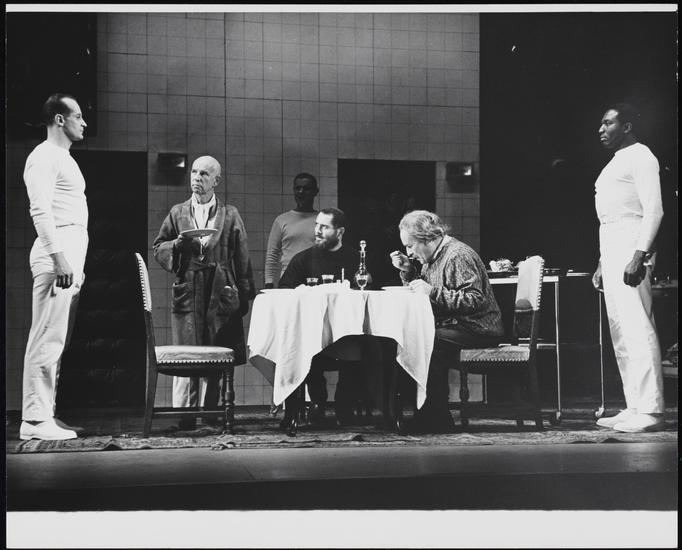 [Robert Shaw as Johann Wilhelm Mobius and Hume Cronyn as Herbert George Beutler (Newton) in "The Physicists".]