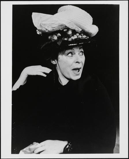 [Siobhan McKenna with Geraldine Fitzgerald backstage at Roundabout Stage One on the eve of McKenna's performance of "Here Are Ladies".]