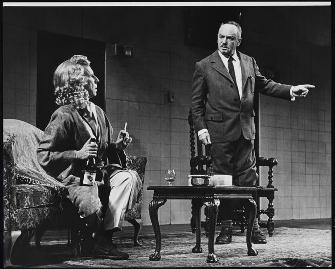 [Robert Shaw as Johann Wilhelm Mobius and Hume Cronyn as Herbert George Beutler (Newton) in "The Physicists".]