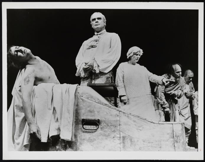 [Michael Williams as the Herald and Ian Richardson as Jean-Paul Marat in "Marat/Sade".]