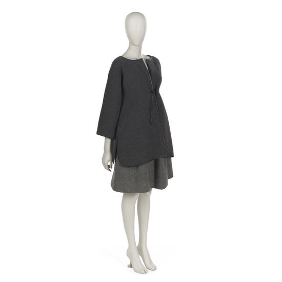 Day ensemble in peppered charcoal gray worsted wool broadcloth comprising jacket and skirt