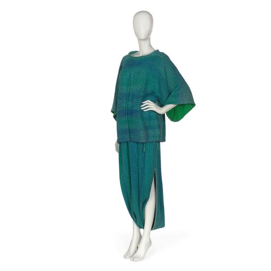 Evening suit comprising jacket, skirt and blouse in cream and gold brocade and aqua wool jersey