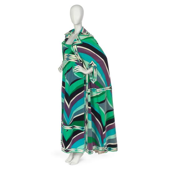 Evening ensemble comprising dress and poncho in red and green double-knit wool jersey