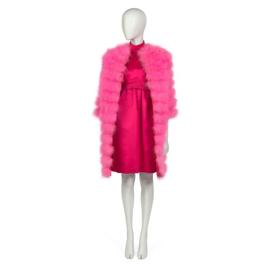 Evening ensemble in petal pink slubbed silk satin comprising coat, dress, underdress and hat