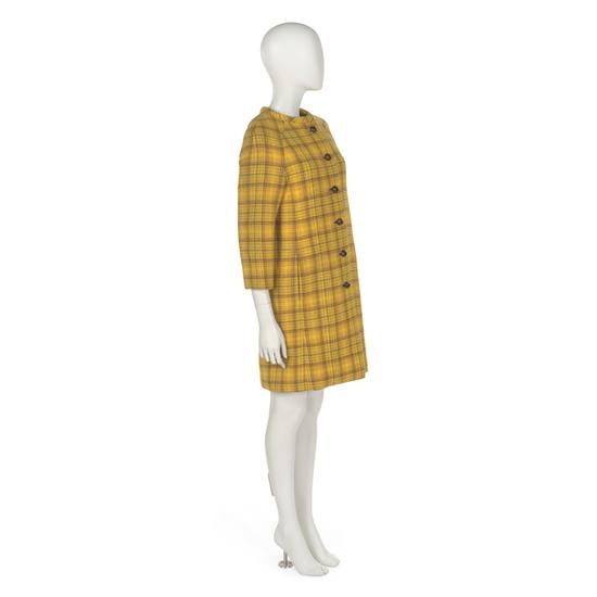 Ensemble in greige and plaid wool gabardine comprising coat and dress