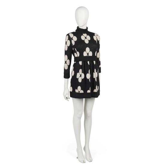 Day ensemble in black, brown, white, rose, and green knit wool