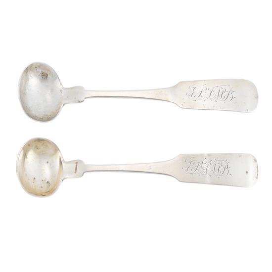 One of a pair of salt spoons with round bowl and downturned fiddle back tipt handle with flared chamfered shoulders. Inscription: Engraved on handle obverse: ESAMB. Mark: Marked on handle reverse: Whitney.