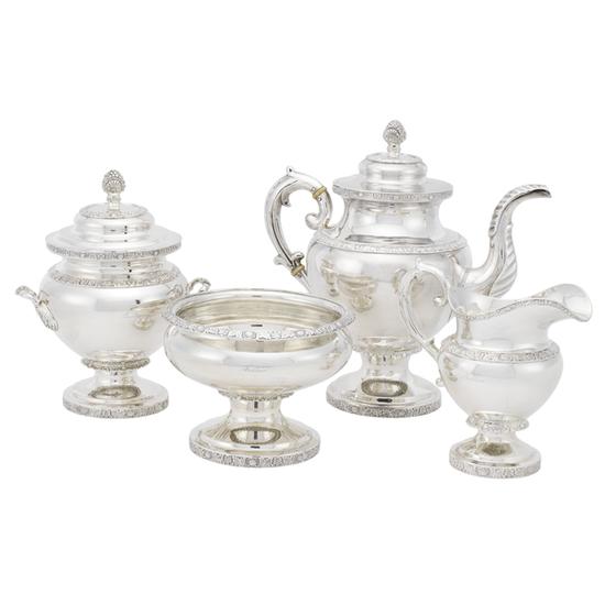 Tea service consisting of teapot, creamer, sugar bowl with separate cover, and waste bowl. Each piece is pyriformed with circular body on circular, stepped foot with die-rolled shell palmette borders applied at shoulder or lip and juncture of body and foot. The creamer has a cast S-scroll handle. Inscription: Engraved on body, in script: Baldwin. Mark: Marked twice on underside of base: J. H. C. Marked once on underside of base: New-York.