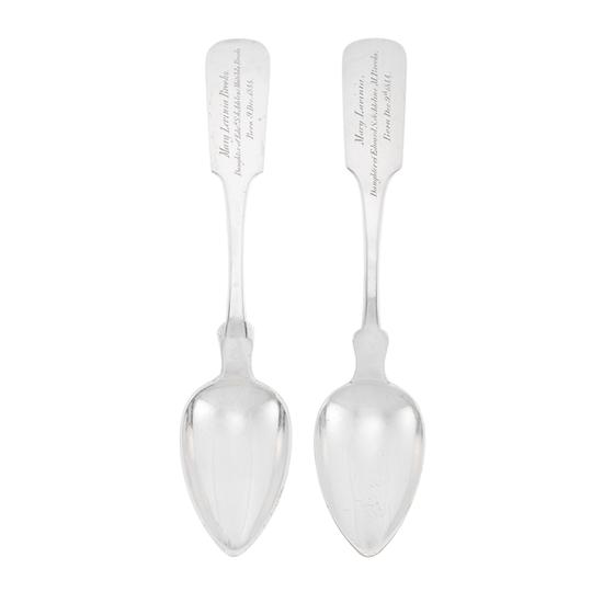 One of two tablespoons with pointed egg-shaped bowl and downturned fiddle back tipt handle. Inscription: Engraved on handle obverse: Mary Lavinia Brooks. / Daughter of Edwd. S.& Adeline M. Brooks / Born 9. Dec. 1844. Mark: Marked on handle reverse: [man's profile] / [star] / [eagle] / A. MATHEY.