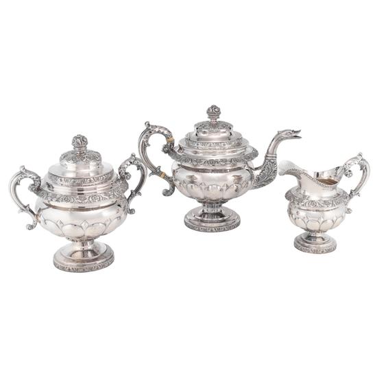 Creamer part of a three-piece tea service with raised round melon-reeded body with diamonds at top of reeds, die-rolled floral-and-leaf borders in three sizes applied at lip, shoulder, juncture of the body and pedestal, and edge of stepped circular pedestal, and S-scroll handle with leaf furl at top. Inscription: Engraved on body: J.M.B Jr. / from his / Grandmother / E.B. Engraved in upper and lower-case italics on underside of foot: Mary Bradhurst 1840 Augusta Currie Field 1880 Mary Pearsall Field 1919 [star] / William Bradhurst Osgood Field Jr. 1929. Mark: Struck once on inside of creamer foot in script within rectangle: W Thomson.